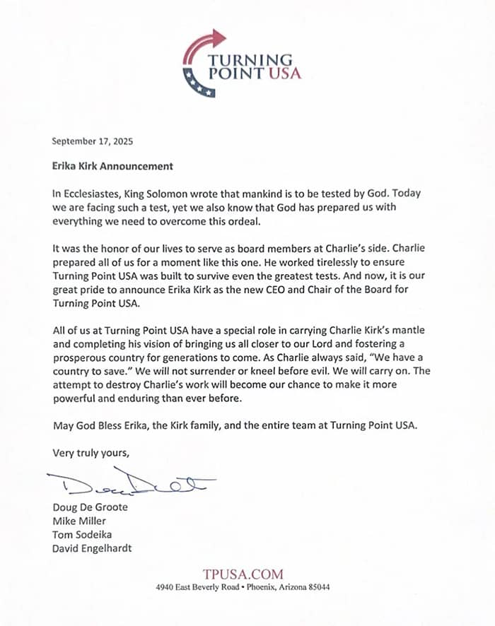 “In prior discussions, Charlie expressed to multiple executives that this is what he wanted in the event of his d*ath,” Turning Point USA’s board stated in an open letter shared on social media.