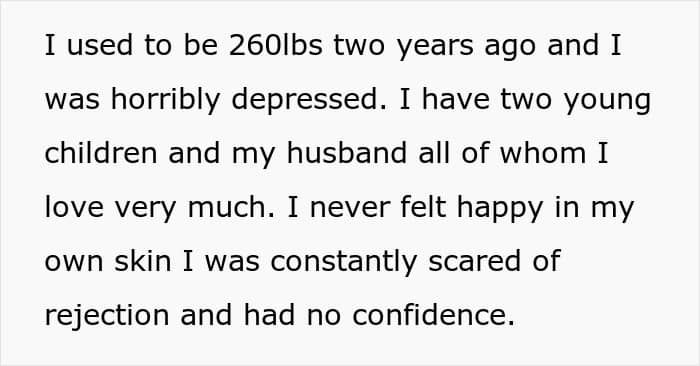This is a classic tale of transformation. Two years ago, a woman was at her lowest, struggling with depression and a weight of 260 pounds (117 kg). Her husband, as she makes a point to mention, met her and loved her then, a fact that makes the rest of this story all the more baffling. She put in the grueling work, and two years and a loss of 100 pounds (45 kg) later, she had completely changed her life.