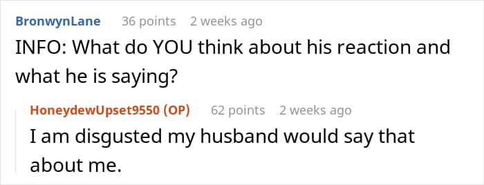 Instead of engaging in a respectful conversation about her feelings, the husband resorted to resentful tactics which won’t get them anywhere. Furthermore, his behavior is part of a larger pattern of unsupportive behavior.