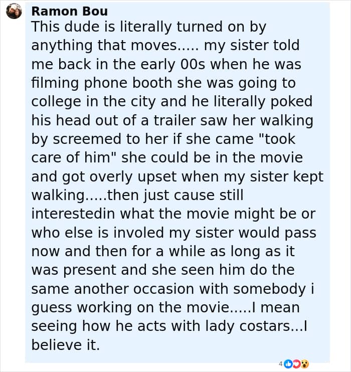 Another thought it was just Farrell being Farrell. They substantiated this opinion with a tale of how the actor had catcalled their sister while he was filming the 2003 movie, Phone Booth.