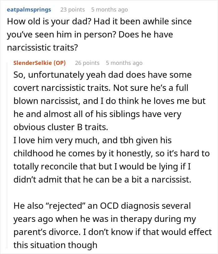This woman invited her dad for a visit, but his comments and actions made little sense