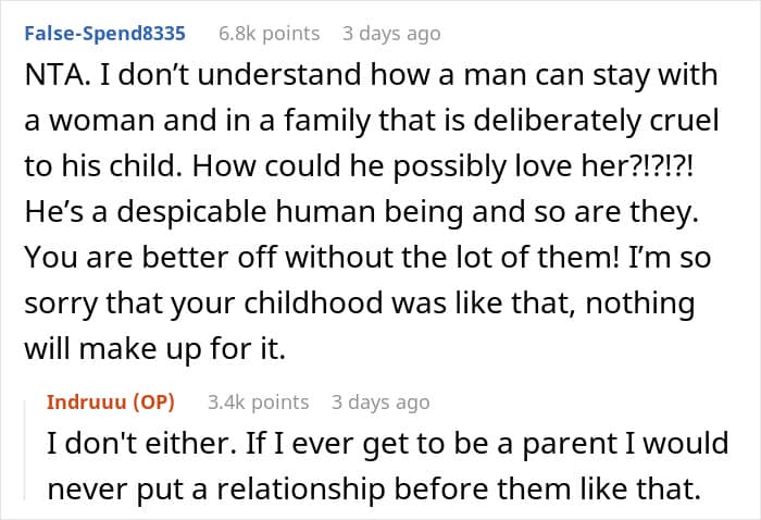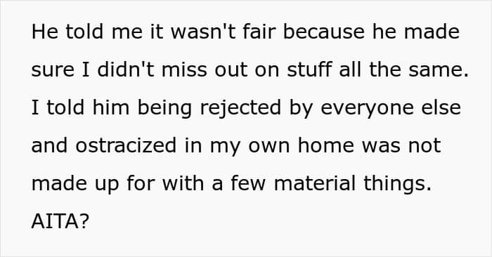 The people that the poster expected to be his family turned out to be the exact opposite, as none of them wanted him. The 7-year-old refused to play with him and even ignored him as if he didn’t exist. But the elder stepsiblings were way worse, as they showered their own brother with gifts and love, while OP was just ignored, rejected, and even bullied.