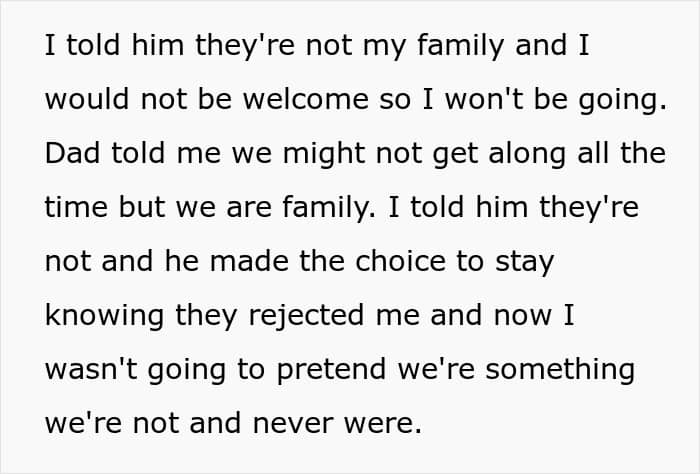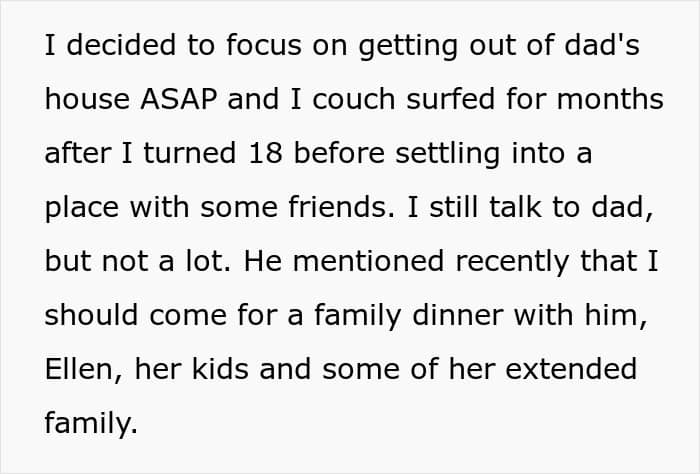 Is it any surprise that OP ditched the toxic house and family as soon as he turned 18, and moved in with friends? Two years down the road, he still talks with his dad, so the man asked him to come for a “family” dinner. Our guy straight out refused, but his dad tried to convince him that, despite the ups and downs, they were still family.