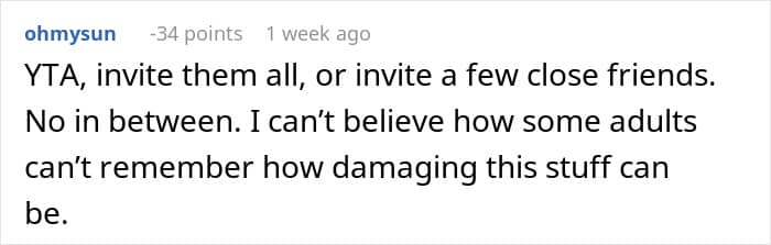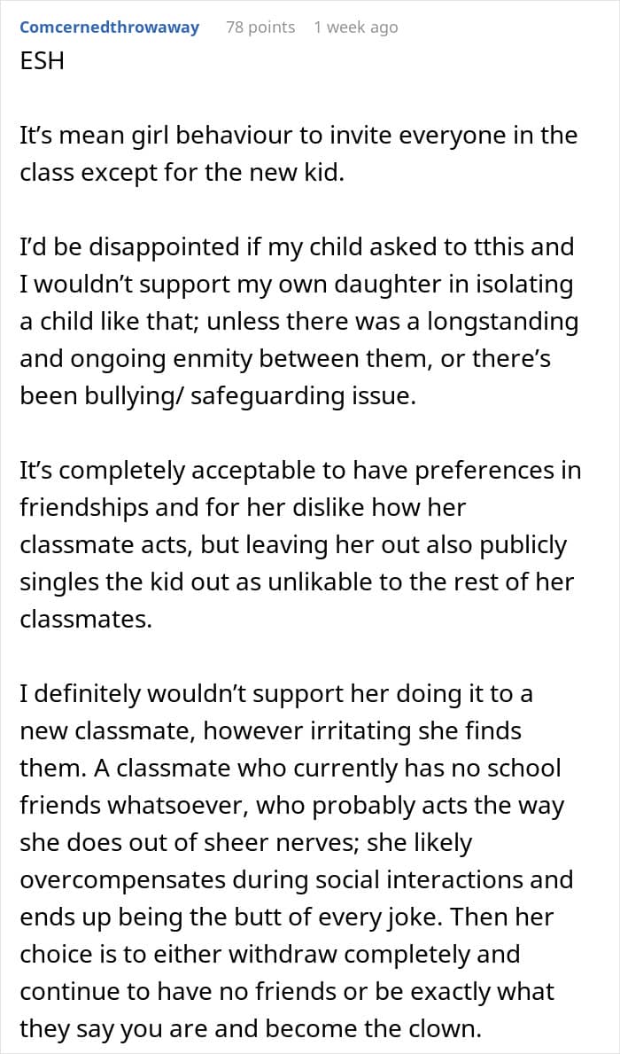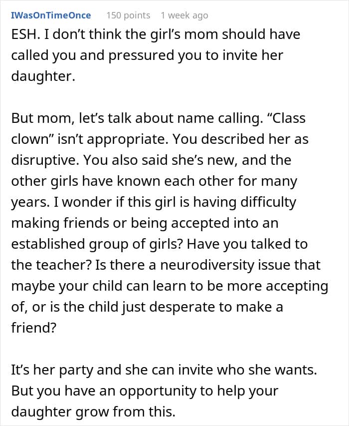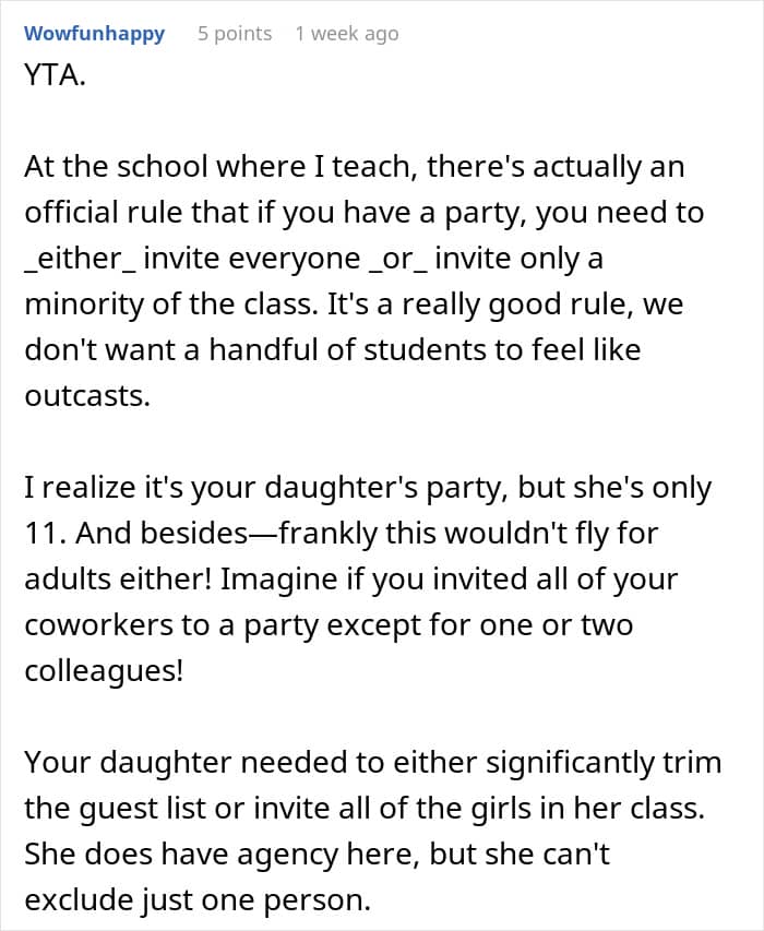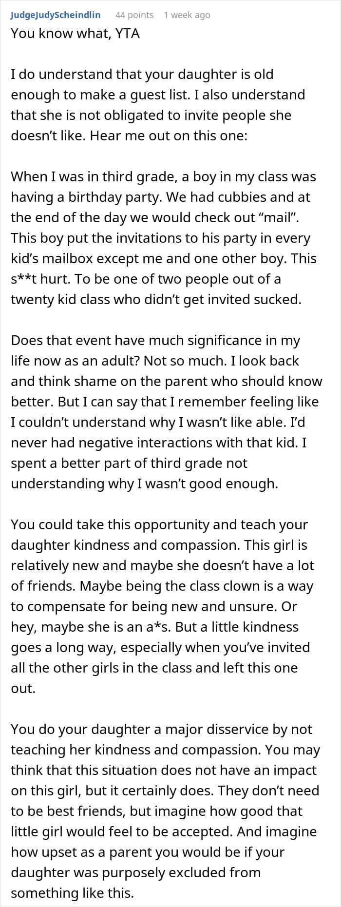 Some folks refer to their own experiences of being excluded as an emotional appeal to this parent. This is all well and good, but it’s also worth considering what the “alternative” ending here looks like. Say the parent is convinced by the comments and decides to make their daughter invite the other girl. Maybe the party goes well, maybe she really is disruptive, but there is a good chance that the hosting girl now holds some resentment both against their parents for changing their invite list and against the girl.
