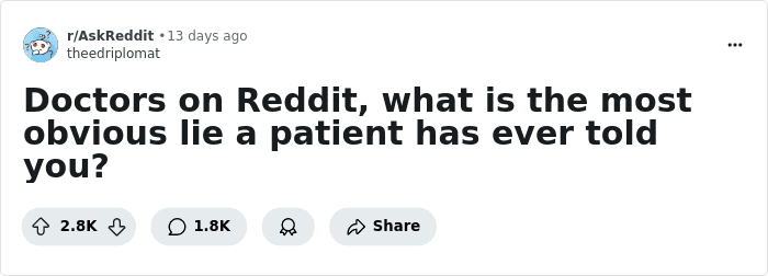 Reddit user Theedriplomat recently asked doctors to share the most obvious lie a patient has ever told them, but the thread quickly gained traction and received responses from nurses, paramedics, and other healthcare workers as well.