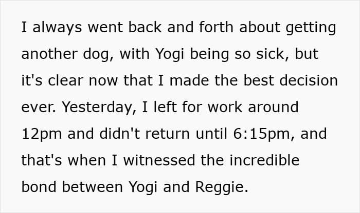 “I always went back and forth about getting another dog, with Yogi being so sick, but it’s clear now that I made the best decision ever,” McArdle wrote alongside the dramatic clip. She explains that she’d been at work for about five hours when she witnessed the incredible bond between the two pooches.