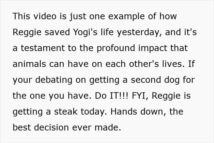 “If [you’re] debating on getting a second dog for the one you have. Do IT!!!” McArdle suggested in her post that Reggie was being handsomely rewarded with a steak for his life-saving efforts. What a very, very good boy, don’t you agree?