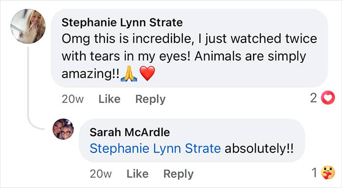 Relieved, McArdle gushes, “It’s a truly heartwarming moment that showcases the power of companionship and instinct.” She added that the video served as “a testament to the profound impact that animals can have on each other’s lives.”