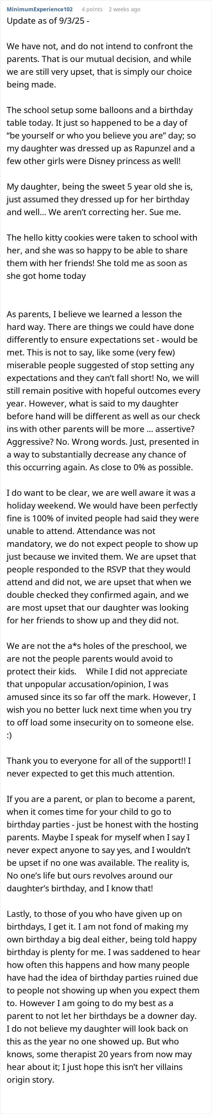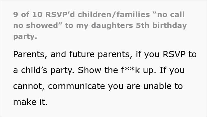 This dad was looking forward to celebrating his 5-year-old’s big day. But the joy quickly turned to heartbreak when 9 out of 10 of her RSVP’d friends never showed up, without so much as a message. His daughter spent an hour waiting by the window, asking when her friends would arrive.