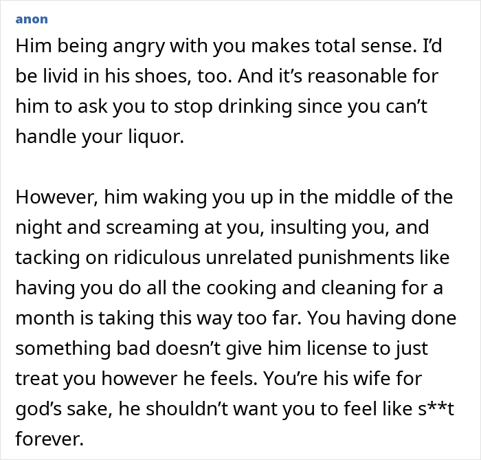 In this particular case, the woman’s drunken moment might’ve been misguided, but her husband’s reaction? It felt extreme. Even after apologizing and doing everything he asked, she’s still being punished daily. What do you think, was she out of line, or is her husband taking things too far? We’d love to hear your thoughts.