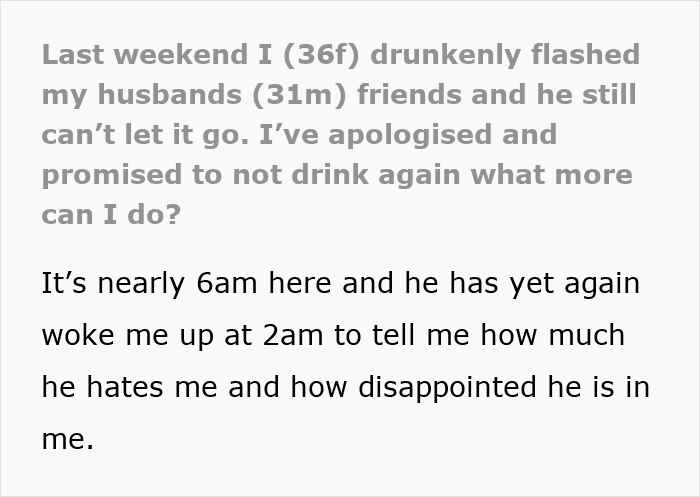 That’s exactly what happened to one woman who shared a painfully honest post about a moment that went sideways. One tipsy joke in front of her husband’s friends turned into a full-blown week of emotional punishment. Even after apologizing and completing a list of things he demanded, he’s still waking her up at night to lash out. Feeling drained, she finally told him she’d leave if he didn’t stop but now she’s wondering if that was too much. Keep reading to see how people are reacting.