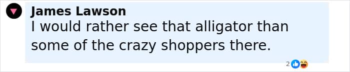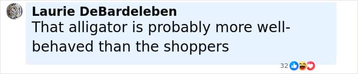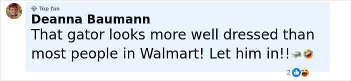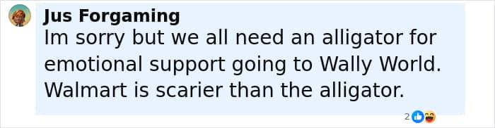 As for the Walmart ban, Humane Animal Rescue of Pittsburgh’s Cienna Chefren shared her expert opinion, saying there’s no predictability to how Jinseioshi is going to act when she’s around strange people or stressful environments. So, it seems that the aisle-cruising alligator’s shopping spree days are over. At least at her nearest Walmart.