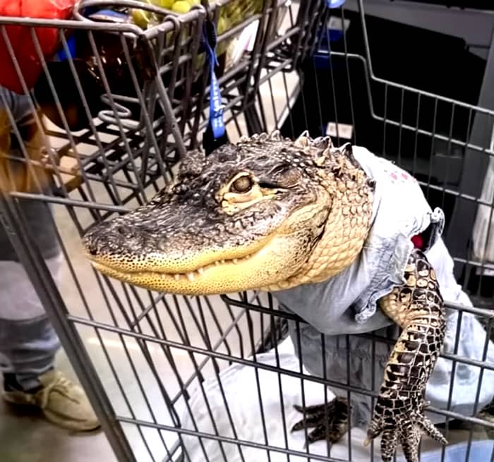 “I looked and I saw this alligator dressed up, standing in there, and his mouth was sticking out of the buggy. I didn’t believe it,” an anonymous woman who took the photos told a news outlet. “I don’t want to shop with alligators,” she added.