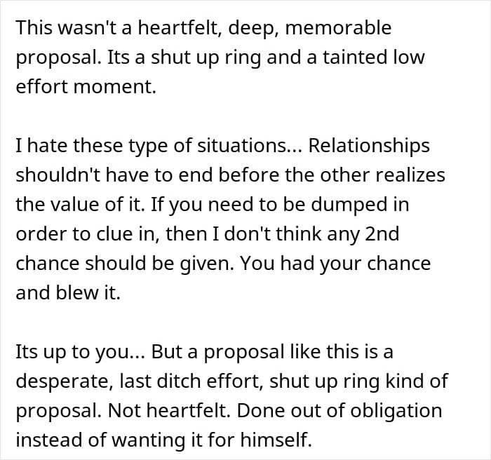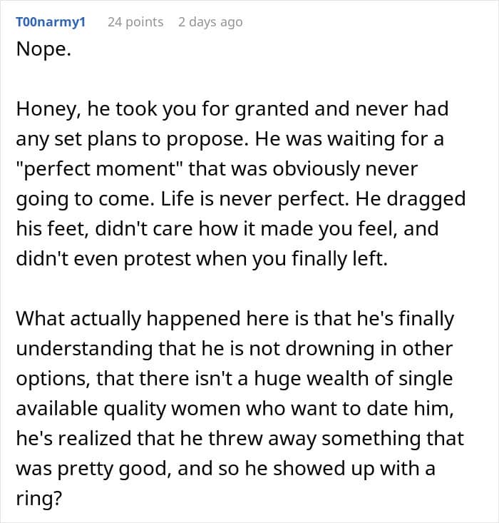 Unfortunately, that wasn’t the case for this couple. Their timelines were completely out of sync, with the girlfriend already waiting for a proposal for a few years, while the boyfriend wasn’t feeling in any rush. Tired of waiting, she decided to break things off, which, as a result, has awakened something in her partner.