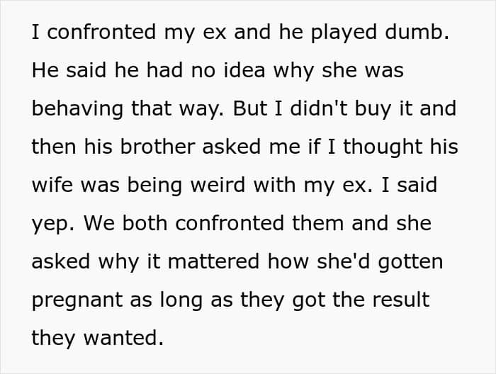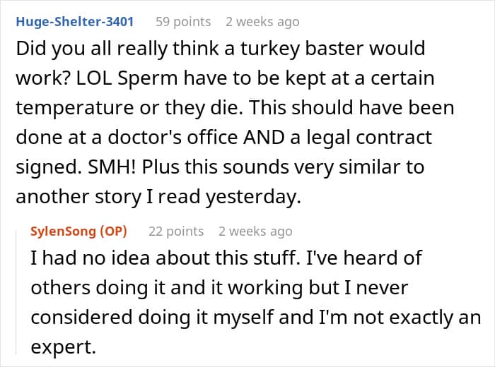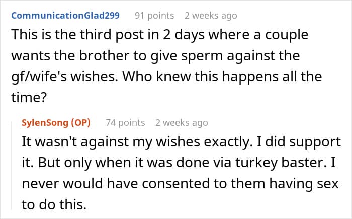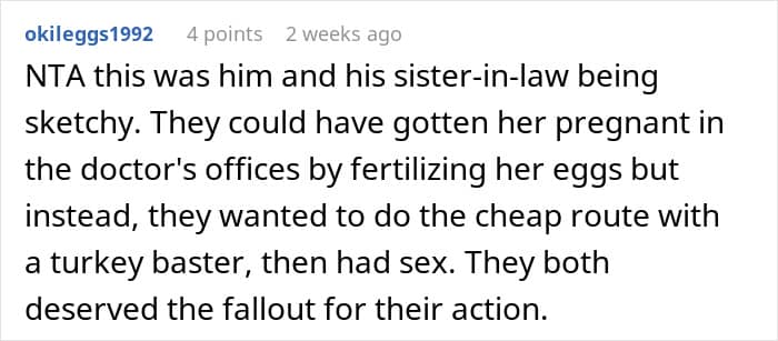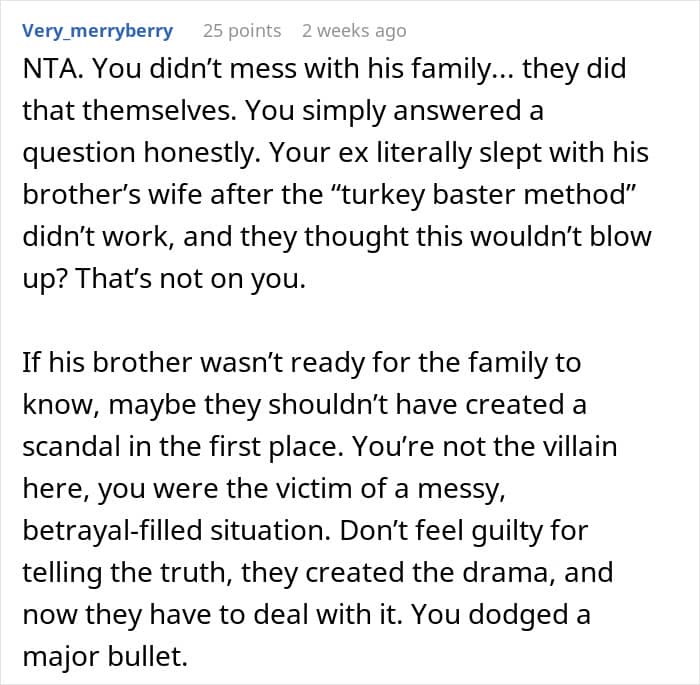 All seemed to go according to plan, until the SIL finally got pregnant and suddenly started acting jealous towards the woman. It then emerged that the woman’s fiance and his sister-in-law had decided to take matters into their own hands because “the Turkey Baster Method wasn’t working.” The woman immediately broke off the engagement and later told his parents and grandparents exactly why. Now she feels guilty for spilling secrets and causing massive family drama.