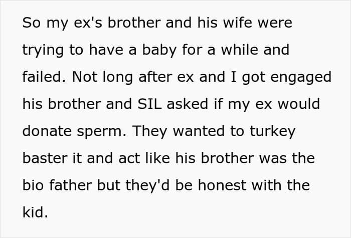 Many couples struggle to fall pregnant and try various methods to fulfill their wish of having a baby. Some go the surrogacy route, some opt for egg or sperm donors, others adopt. One woman shared how she agreed to let her fiance donate sperm to his brother and sister-in-law, who were desperate to start a family.