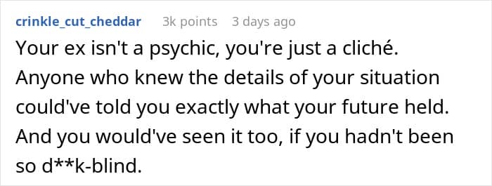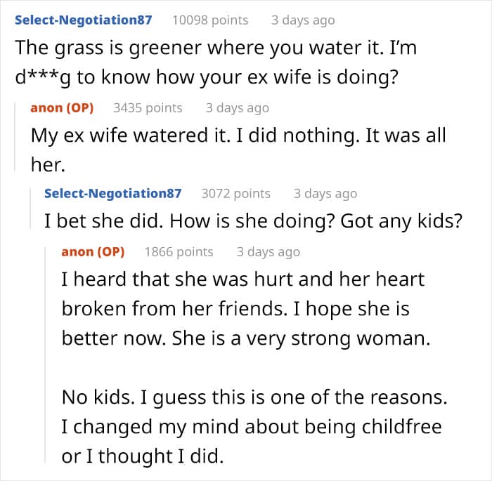 Unfortunately for the man, he let his desire for the excitement of a new relationship cloud his judgment. It wasn’t until the girlfriend’s unpleasant personality reared its ugly head that he realized what he had lost with his wife. It may take a while before he recovers from the disaster of his own doing.