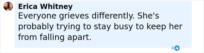 But many have risen to face off Erika’s critics, slamming the conspiracies in favor of a simple explanation: “Some people grieve by throwing themselves into work.”