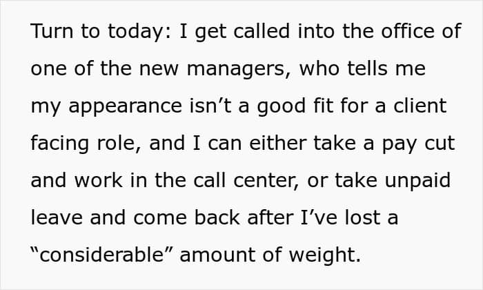 However, a new manager claimed she wasn’t fit to be in a client-facing role, and asked her to be demoted or take “unpaid leave” to lose weight