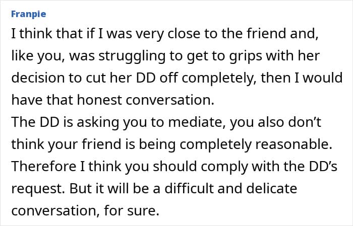 Here, the young woman was clearly asking for help, which is why the poster felt a strong urge to support her. She had known her best friend’s daughter ever since she was a baby, which is also probably why she felt such a strong obligation to go and meet her and maybe work things out. The only thing she was conflicted about was whether she should tell her friend about it or not.