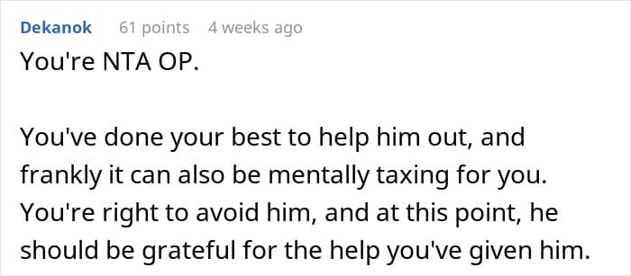 Since he kept complaining about the numerous things that he was still struggling with, their friends supported him as much as they could. However, one day, OP realized that she couldn’t keep doing this when he refused to step up and take responsibility for himself. He even came in late at work, so she called him out as his manager, but he called her a jerk for trying to “sabotage” him.