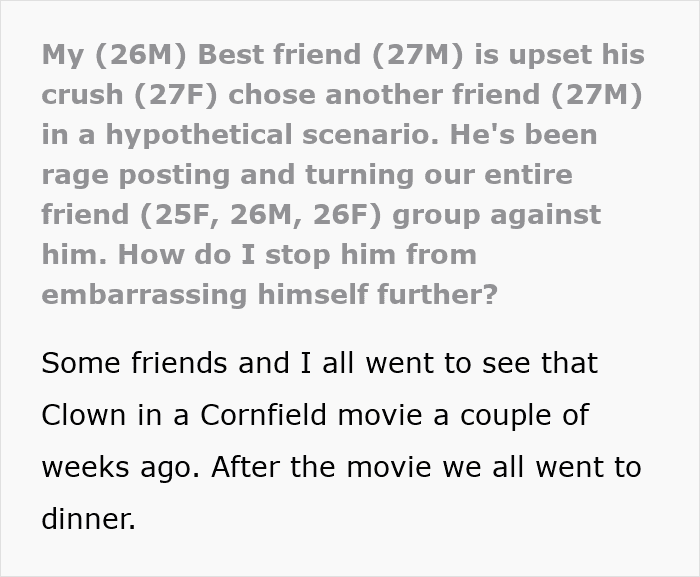 That’s what the original poster’s (OP) friend is doing after his crush rejected him and also chose another friend in a hypothetical scenario. The guy just lost it, but now, his annoying actions are actually driving a wedge between him and his friends. Read on to uncover what really happened!