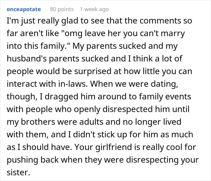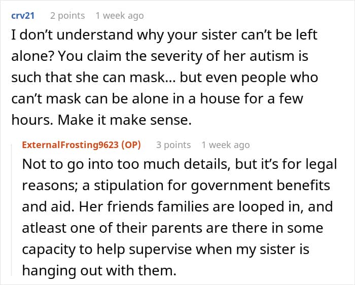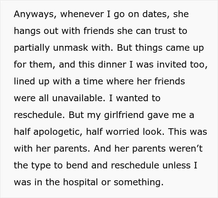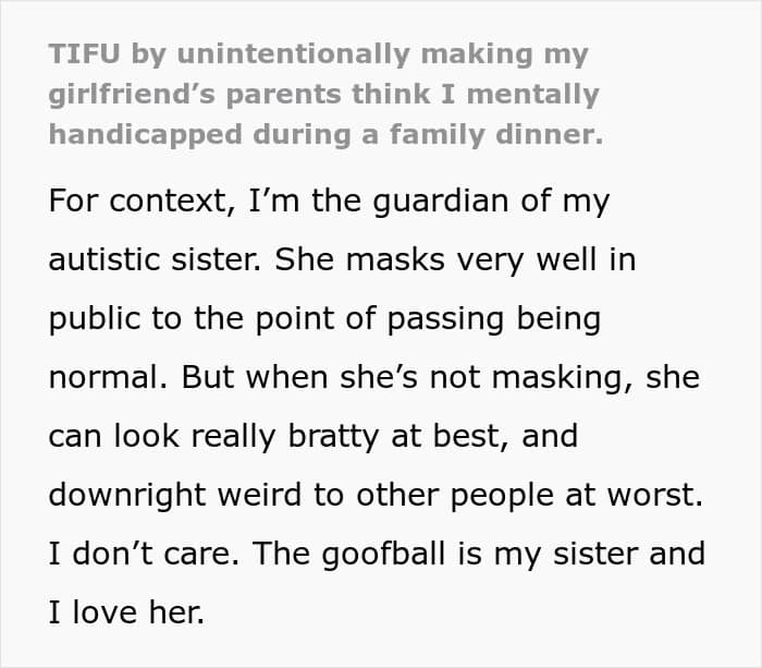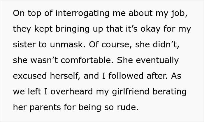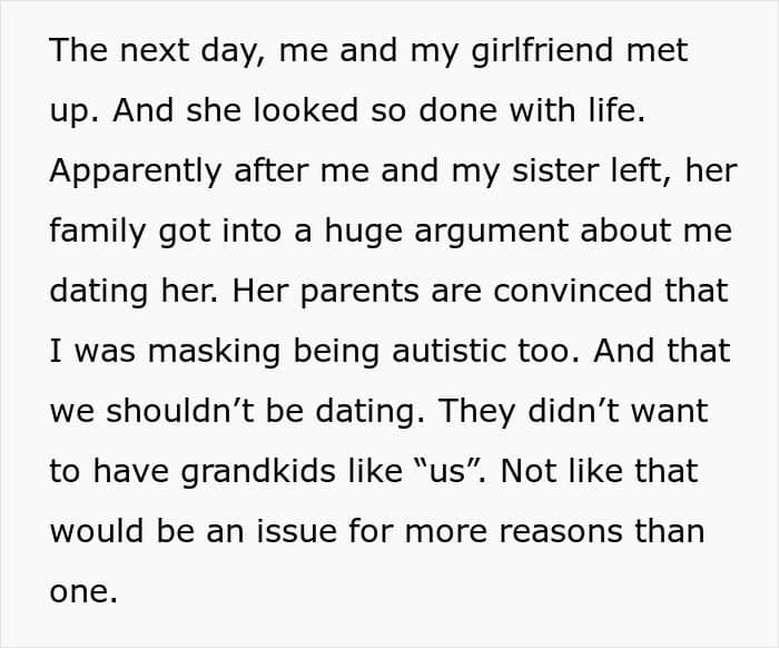 The dinner was an immediate masterclass in condescending ableism. The parents spoke to his sister in a slow, high-pitched baby voice and repeatedly pressured her to “unmask,” ignoring the fact that she was deeply uncomfortable. Despite the man and his girlfriend’s best efforts to steer the conversation, the parents’ grating assumptions and interrogations continued until his sister understandably wanted to leave.