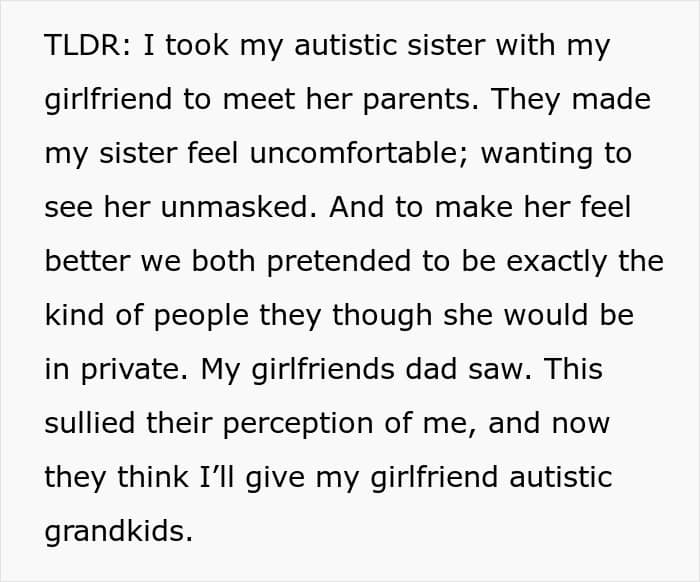 A man brought his autistic sister to meet his girlfriend’s notoriously difficult parents, and the parents immediately showed their ignorance, pressuring his sister to ‘unmask’ for them