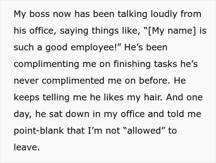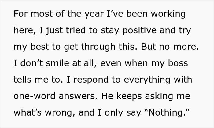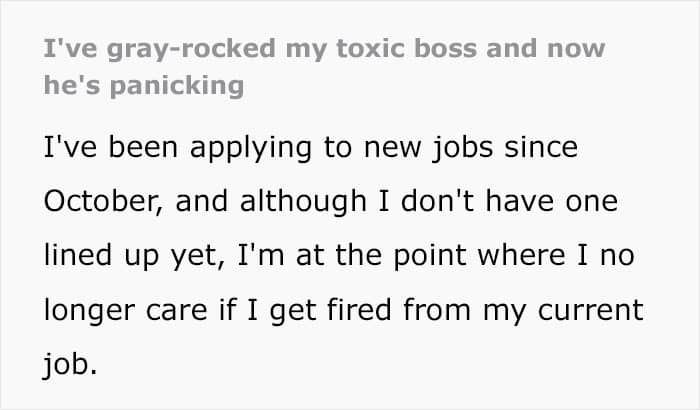Well, enough was enough for OP one day and she, sensing she’s going to have another job soon, started seriously gray-rocking. For the longest time, the boss was trashing the employee, saying she’s lazy and whatnot. But once he caught wind of what’s up, he seemed to grow fearful of it and changed his game 180 degrees. But we all know it’s a fake kind of nice.