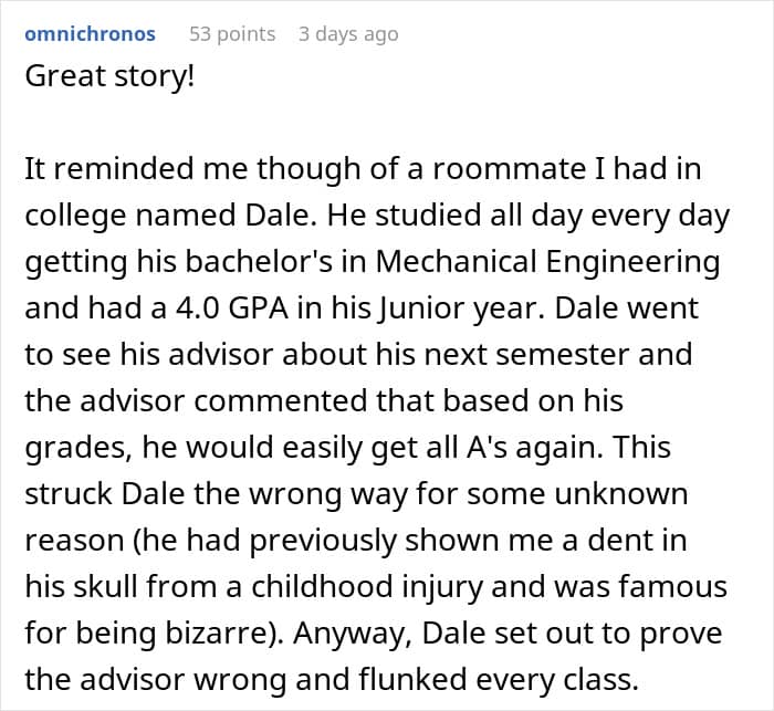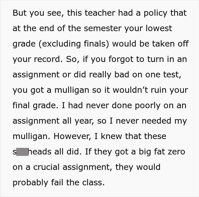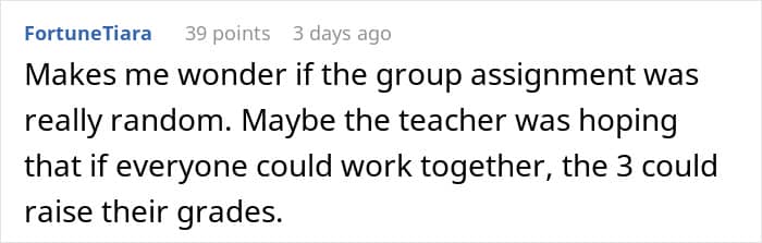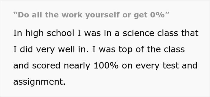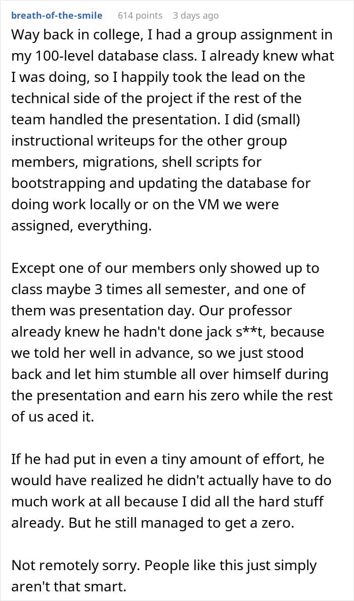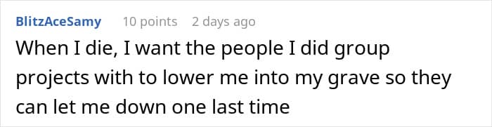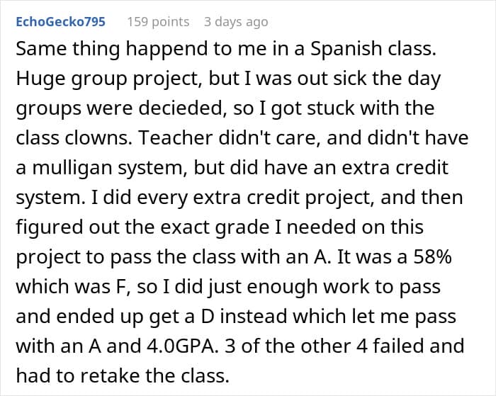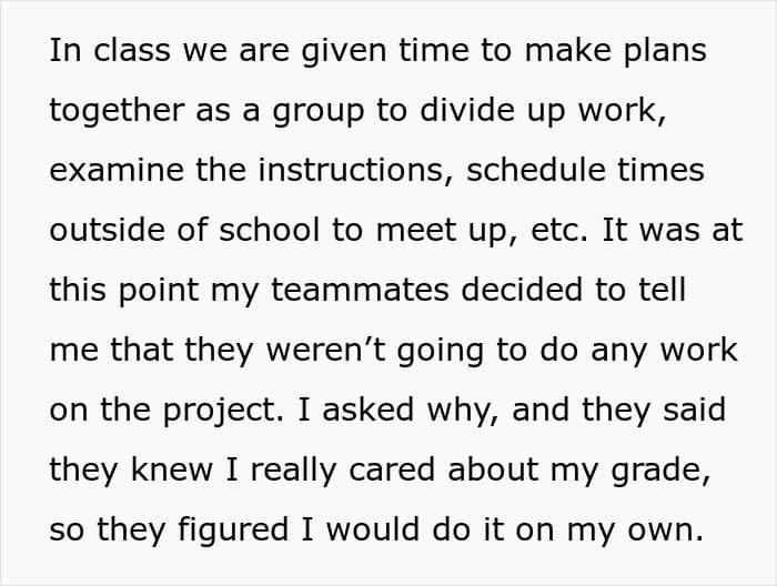 A similar thing almost happened to this student (now an adult), whose teammates expected him to do all the work alone because he cared too much about his grades. But instead of complying with them, he outsmarted them, which they very much didn’t appreciate.