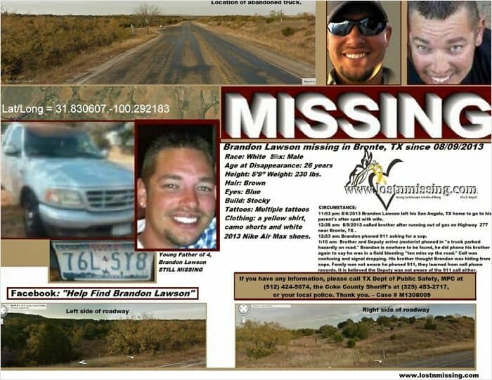 After running out of gas on a remote Texas highway, Brandon Lawson made a frantic and confusing 911 call. In the recording, he can be heard saying he “accidentally ran into” some people and that he needed the cops, not an ambulance. Later, in a final, brief call to his brother, Brandon claimed he was “bleeding” in a nearby field, but he was never found.