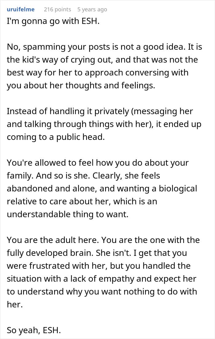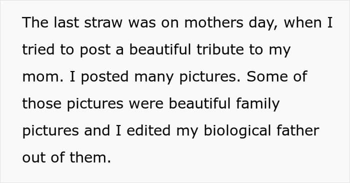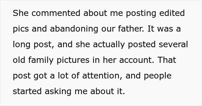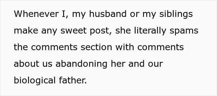 Things hit a peak on Mother’s Day when OP shared a heartfelt tribute to her late mom and her half-sister quickly hijacked the post with angry comments. She even uploaded old family photos, shaming her for editing their dad out. This time, OP finally snapped, telling her half-sister to get therapy, respect boundaries, and stop obsessing over her life. Now, however, she’s wondering if that was a jerk move.