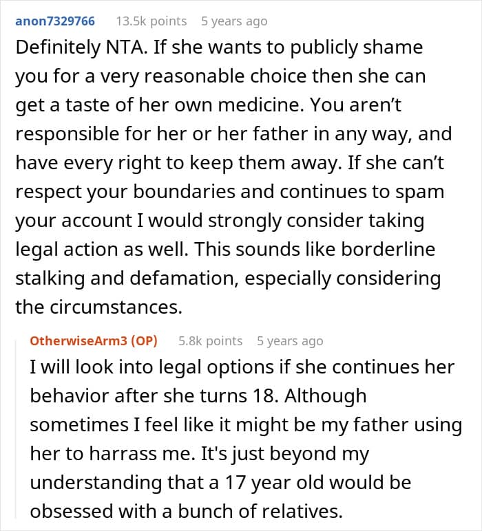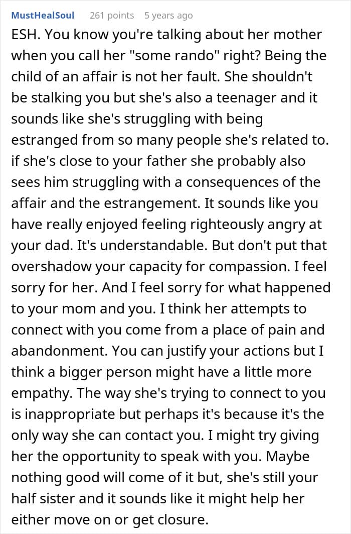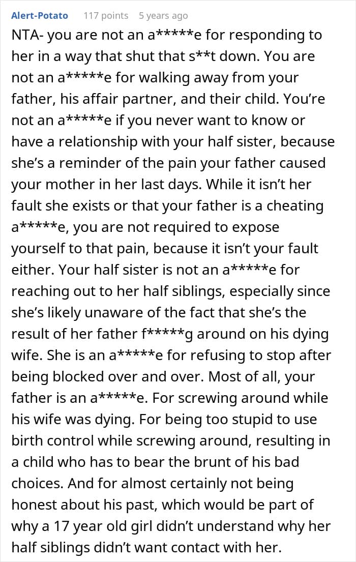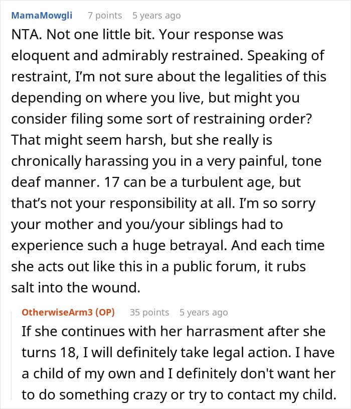 Being just 17 and full of resentment as it is, it’s no wonder OP’s half-sister is suffering, but that’s still no excuse for her tirades and trolling. As OP suggested in her somewhat blunt response (who can blame her?), therapy sounds like a good option.