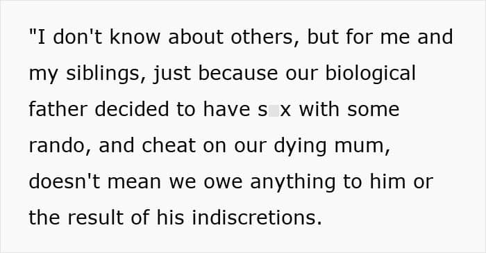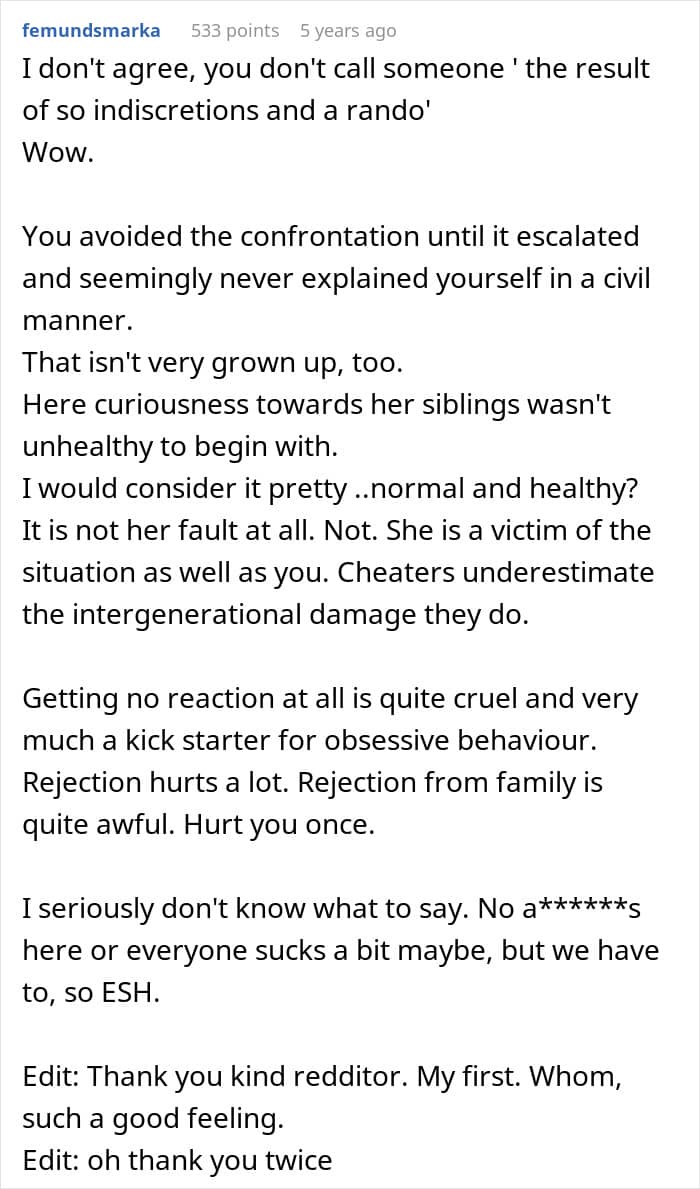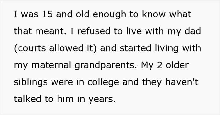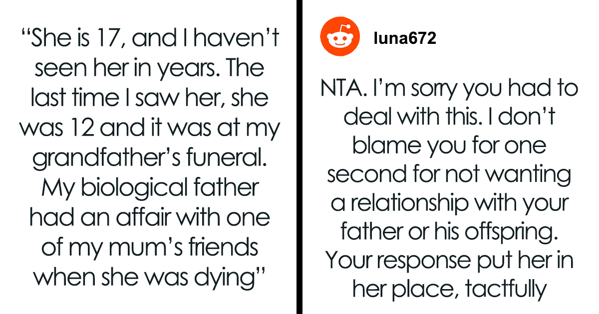 Growing up, she cut all ties with her cheating dad and lived with her maternal grandparents, while her siblings stayed away in college. Her half-sister, on the other hand, has grown up under a completely delusional narrative, one where OP’s dad is painted as the victim and the older siblings as villains who abandoned both him and her.