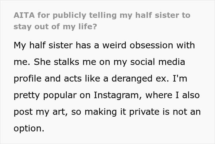 It might sound like something straight out of a messy family drama, but for OP, it’s painfully real. Her estranged 17-year-old half-sister has developed a disturbing obsession with her, stalking her Instagram and spamming the comments whenever she shares her art or sweet family moments. No matter how often OP blocks her, new accounts just keep popping up spewing nothing but hate and baseless accusations.