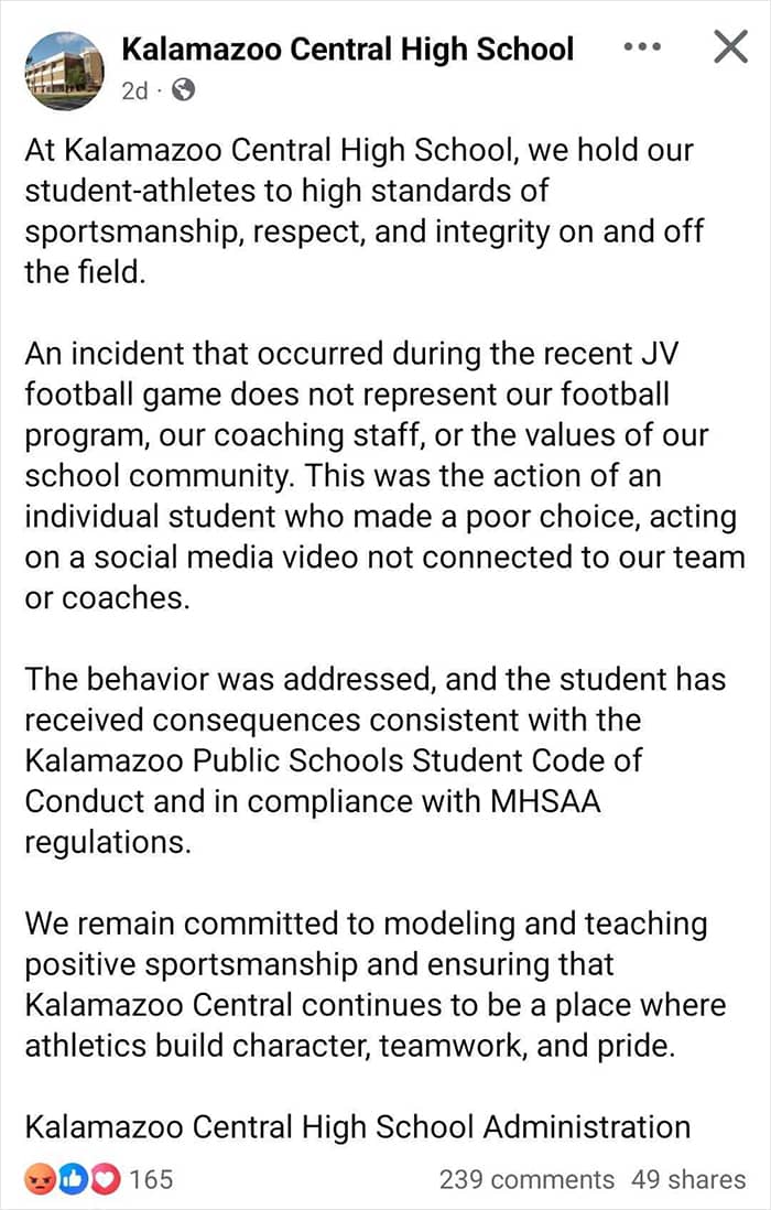 The incident unfolded during a Thursday evening JV matchup between Lakeshore and Kalamazoo Central high schools.