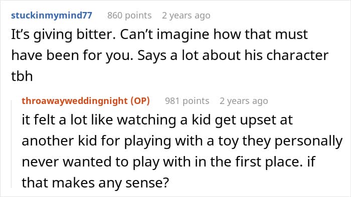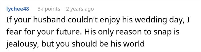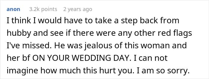 Worst of all, this is a jealousy of entitlement: the notion that your previous feelings give you a permanent stake in somebody else’s love life. They don’t. You can have your feelings where you want, but you don’t have the right to make somebody else uncomfortable, nervous, or miserable because you’re having a hard time controlling them. His behavior at the wedding was, to put it charitably, downright ugly and she was correct to notice that something was off.