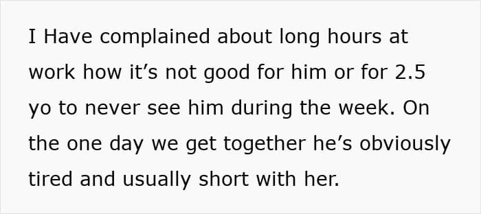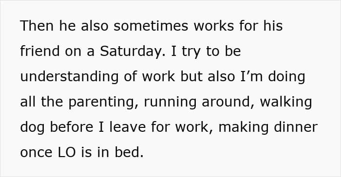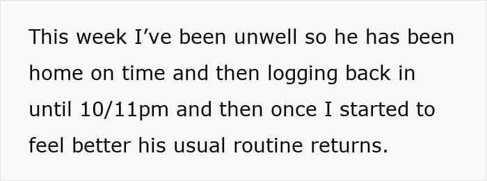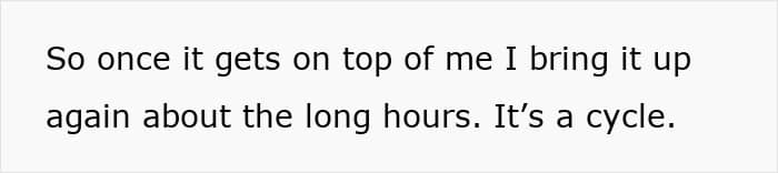 The OP noted that her husband often left the house at 5 a.m., squeezing in gym time before work, and then sometimes hitting the gym again after returning. She added that sometimes he might log back in to work until 10 or 11 p.m., and would also work for a friend on Saturdays.