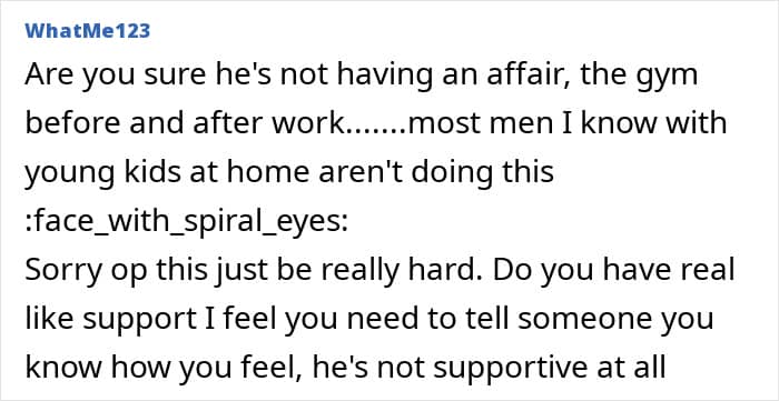 Netizens questioned the husband’s fidelity and criticized his lack of parenting involvement and his seeming inability to understand what it means to be a father or husband. Others focused on the incompatibility between the OP and her husband, suggesting that her concerns are unlikely to be resolved.