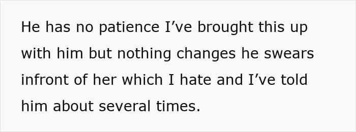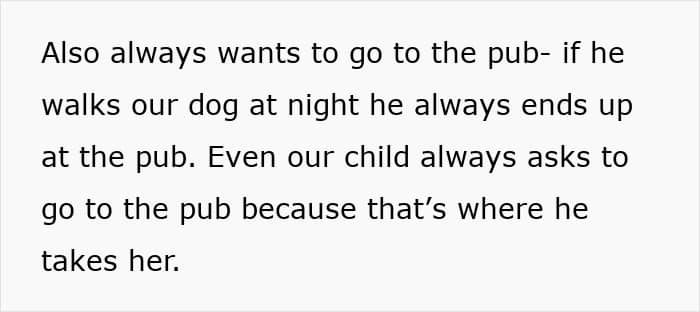 She stated that she repeatedly raised concerns about his long hours, lack of presence, impatience with their toddler, swearing, and hidden smoking habit, and while he would try to improve for a week or so, his old habits would return. He would also go to the pub and take their child along to the point that all their daughter wanted to do was go to the pub.