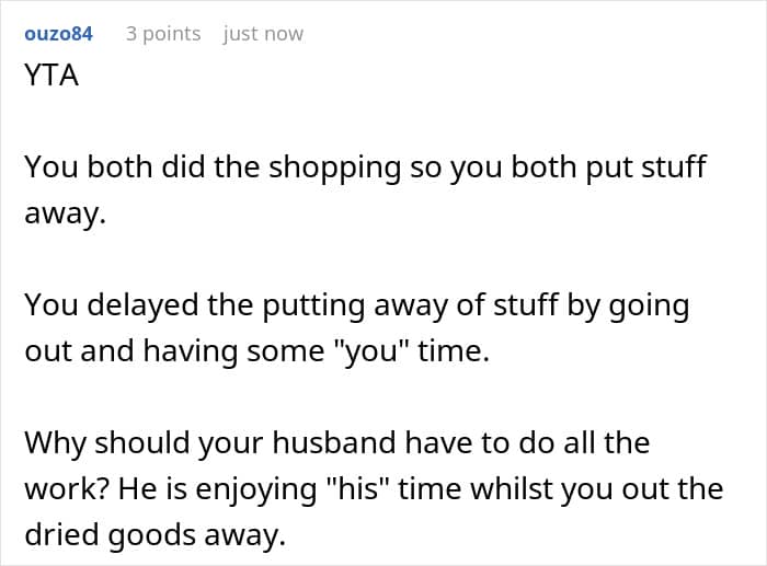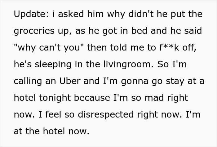 This man, however, could not be bothered to heed his wife’s request to put up the groceries. His weaponized incompetence and foul-mouthed responses led to a huge fight that pushed the woman to storm out of their home and spend the night somewhere else.