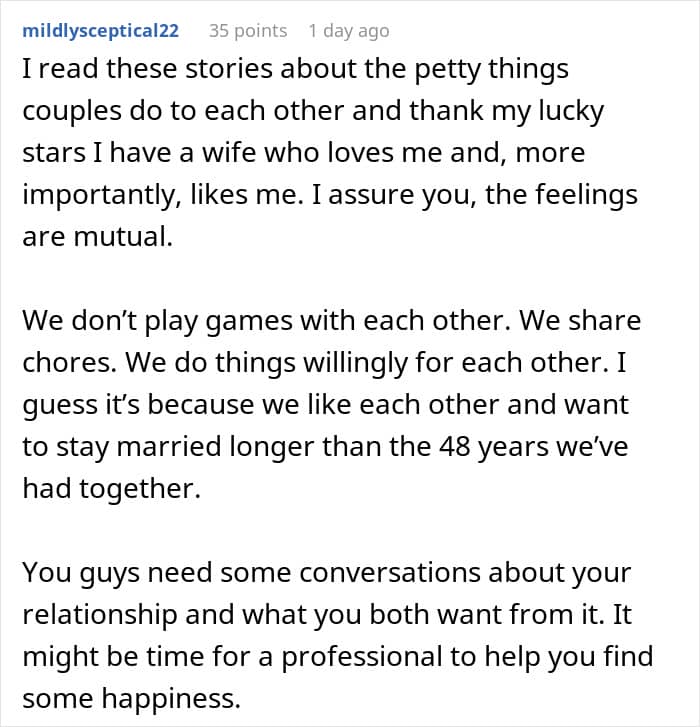 In the story’s case, however, the couple could have handled their argument better. The man was clearly out of line by refusing to help his wife and cursing her while he was at it. For her part, the author was also at fault by fanning the flames and storming out.