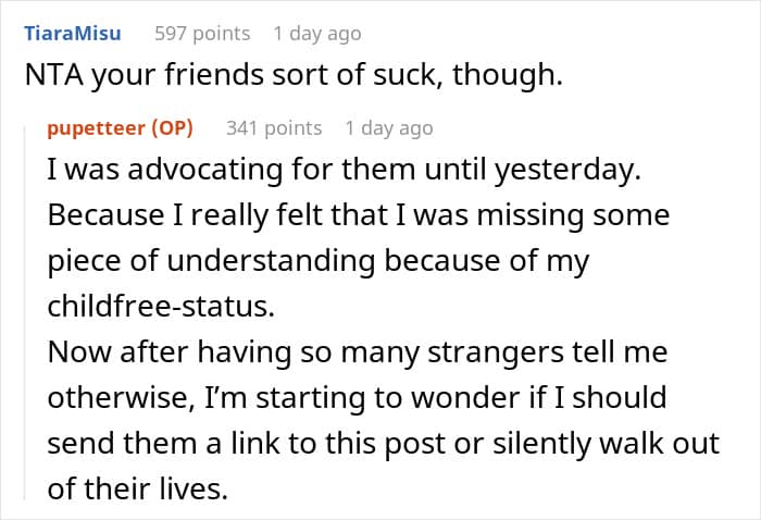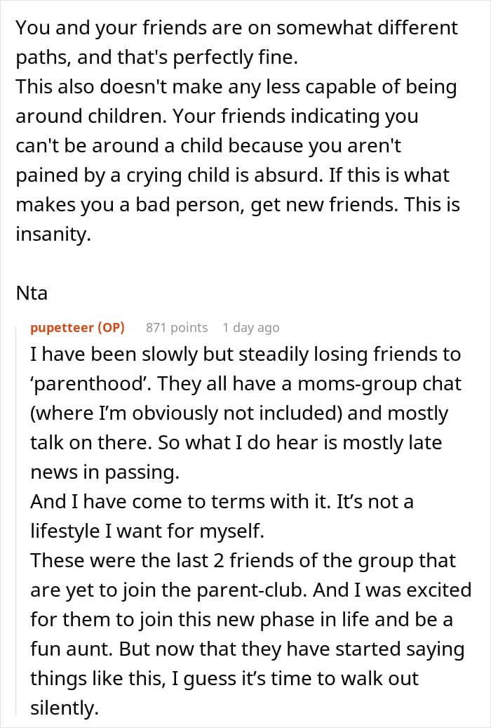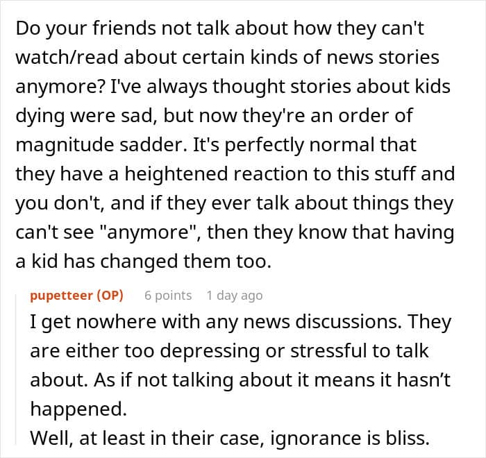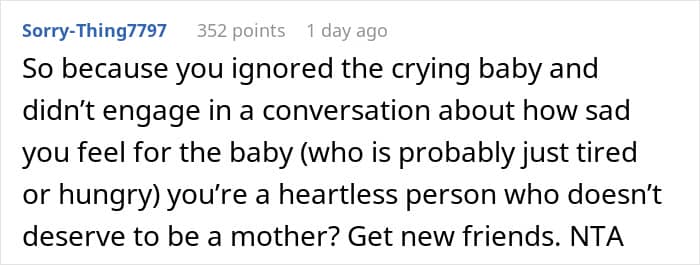 One Redditor experienced this possible rift with her own friends. As she was out with them – one who’s a parent and the other who’s pregnant – an interesting argument broke out. The friends called out the OP for not responding maternally to a crying baby, calling her “heartless.” Wanting to check if her reaction was as inappropriate as her friends claimed, she turned to the Internet.