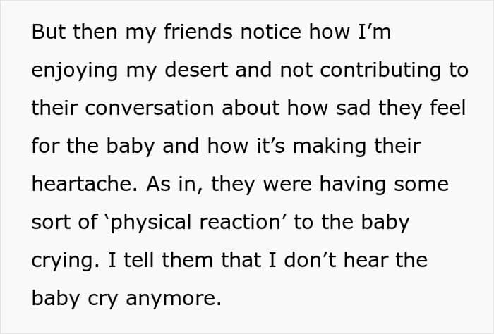 But this woman didn’t get to enjoy hers because her friends called her out for ignoring a crying baby
