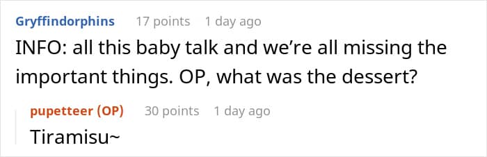 The OP gave more context about the friendship, her choice to be child-free, and what dessert she was eating