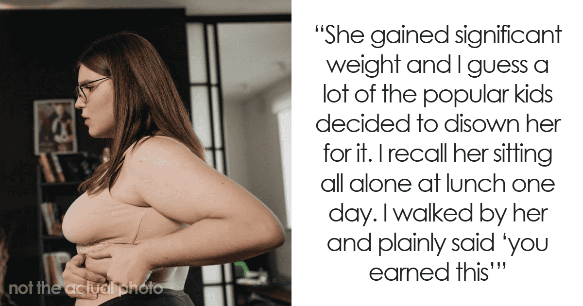 Anyways, she gained significant weight our Junior/Senior year in high school, and I guess a lot of the popular kids decided to disown her for it. I never actually heard anything, but I recall her sitting all alone at lunch one day. Not my best moment, but I walked by her, pointed, and plainly said “you earned this”.