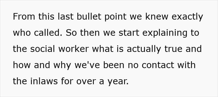 If that sounds horrendous, just wait until you read what they did next. OP and her husband have been no-contact with them for a year, and refused to invite them when other relatives came to see their newborn. That went well, but trouble came knocking just 3 days later, when CPS showed up at their door! The report contained ridiculously false allegations against the couple.
