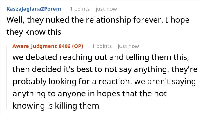 “I feel like there are two different sides to this: in-laws harassing people and in-laws having a temper tantrum,” claimed OP when We reached out to her. “I think in our case, this is a one-off and here I would suggest not feeding into it, as they’re looking for a reaction,” she advised.