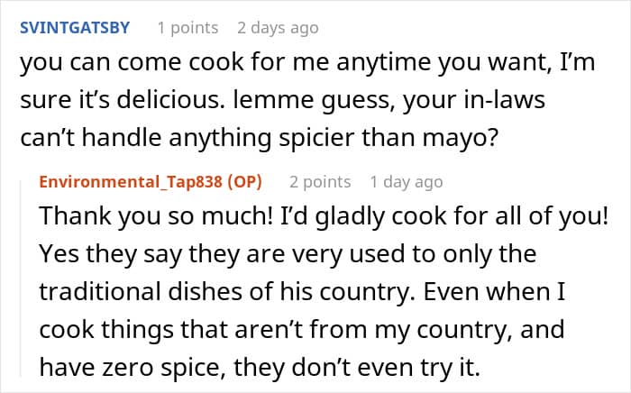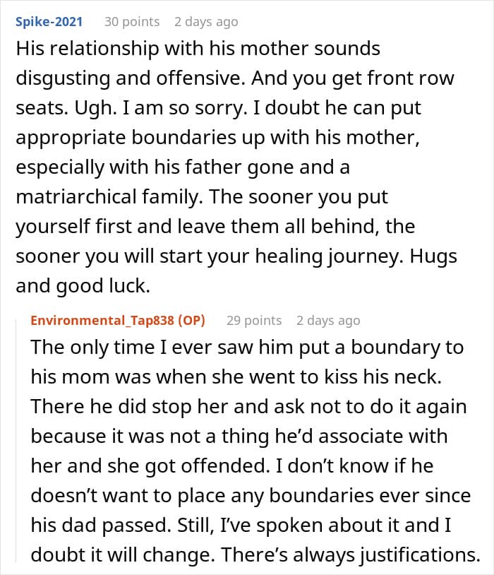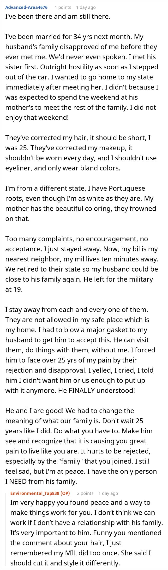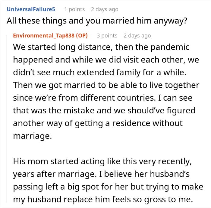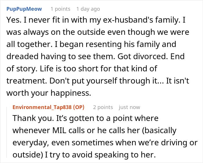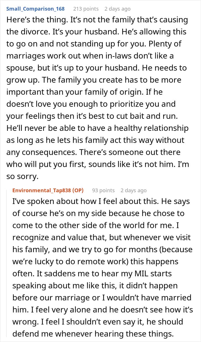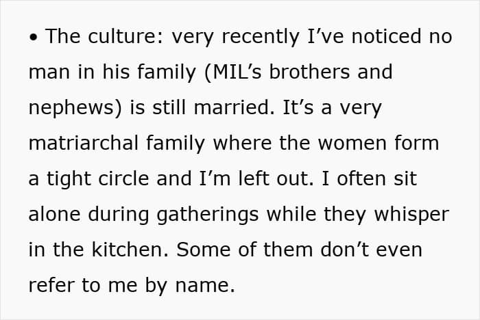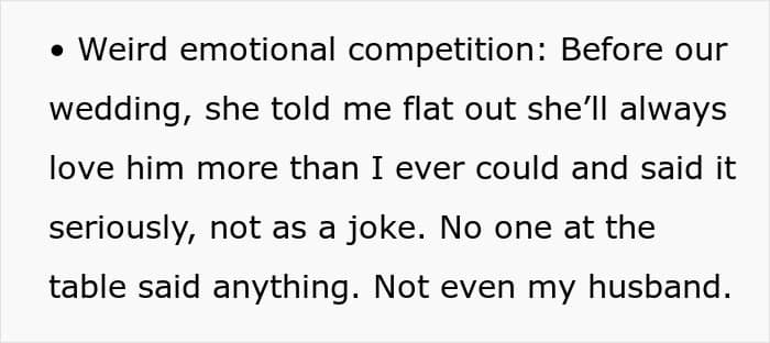 The boundary-crossing is a family sport. Her MIL makes passive-aggressive jokes about her being a foreigner who “stole her son” (which her husband laughs at) and mocks her love of books. The cherry on top was the pre-wedding declaration from her MIL that she’d “always love him more,” a statement met with deafening silence from the entire family.