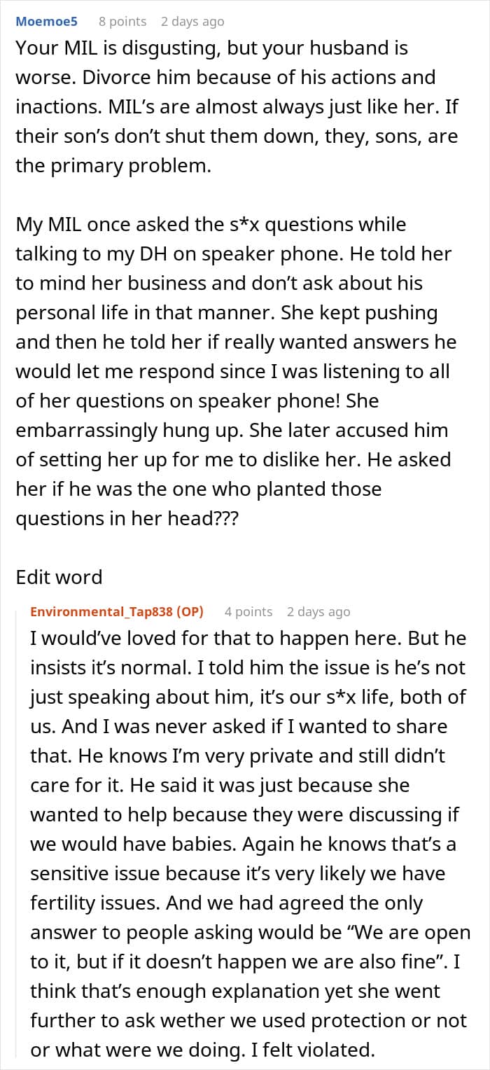 This woman’s mother-in-law asked invasive questions about her intimate life, and her husband defended it